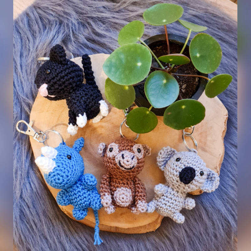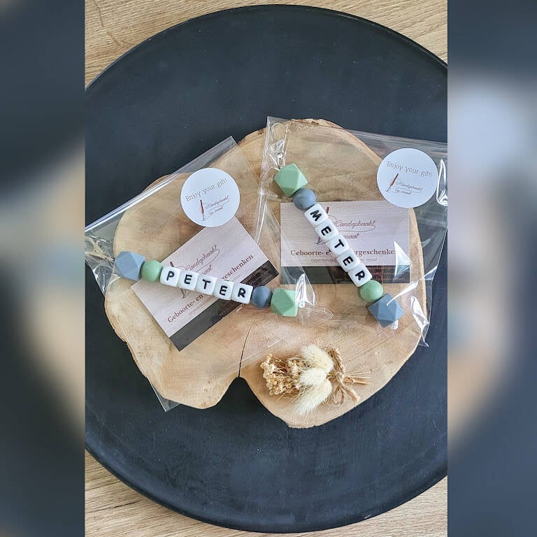 Tekst en kleuren zijn zelf te bepalen. Kan ook zonder tekst, enkel met gekleurde kralen. Ook een combinatie van een gehaakte sleutelhanger met een kralen sleutelhanger is mogelijk.