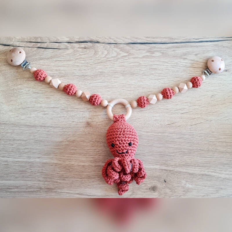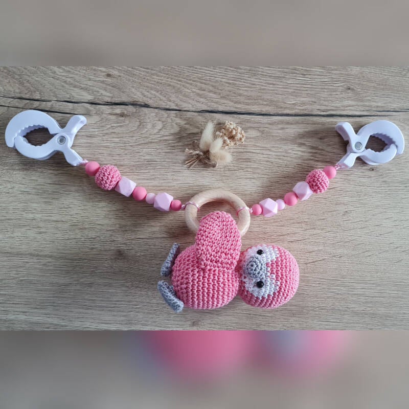 - Wagenspanner met kralen en gehaakte rammelaar: € 40 / € 45 (enkel hoofd / volledig dierenlichaam)